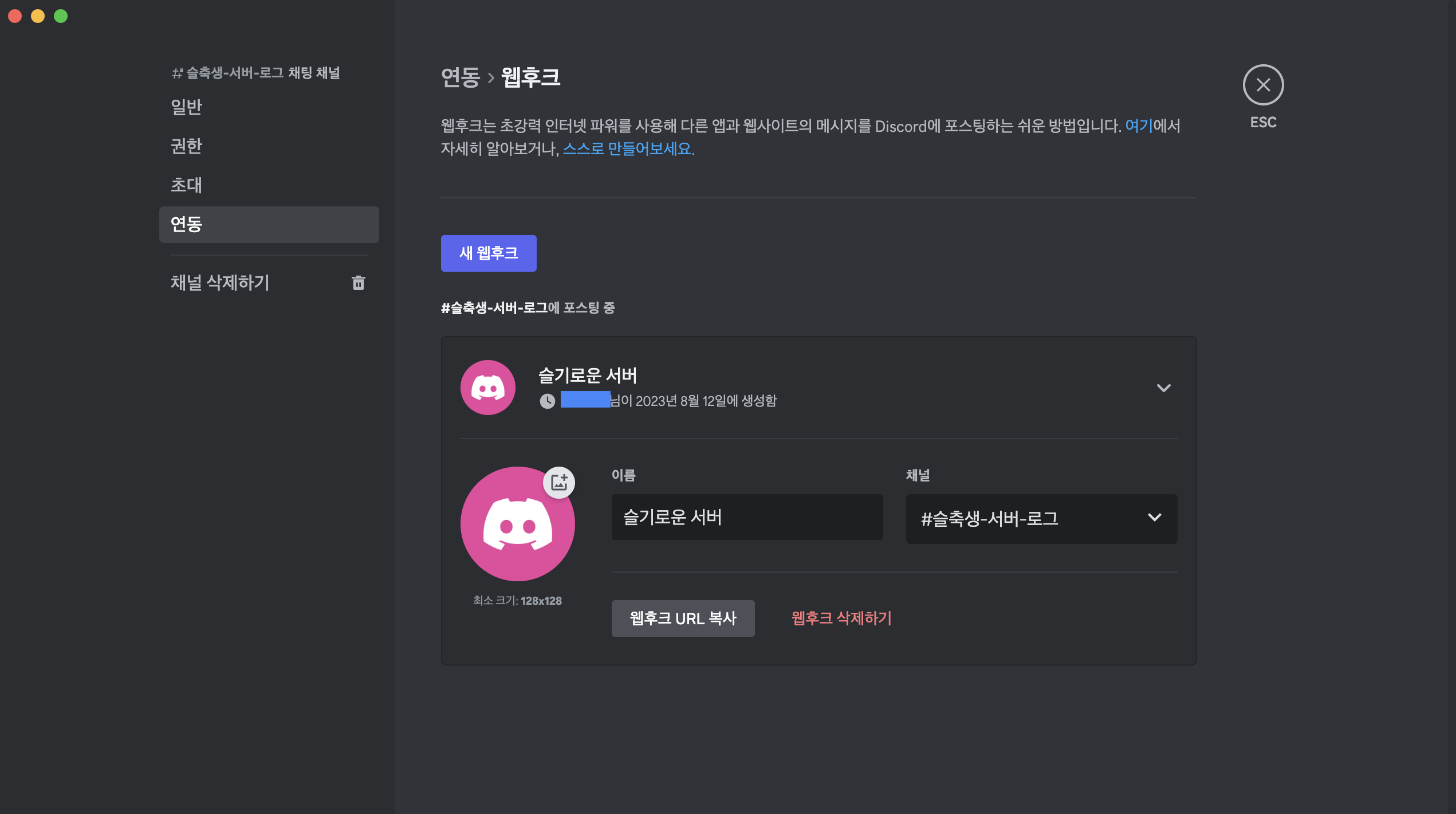 디스코드 웹훅을 어떻게 사용하는지 설명하기 앞서 저희 팀은 회의를 할때 디스코드를 주로 사용해서 회의를 진행합니다. 그래서 디스코드 채널에 팀원 모두가 볼 수 있게 서버 로그라는 메세지 채널을 생성했습니다. 이 메세지 채널의 설정을 누르고 연동으로 가서 웹 후크를 생성하면 됩니다! 웹 후크 URL로 적절한 바디값을 담아서 POST 요청을 보내게 되면 아래와 같이 알람을 보내게 됩니다!
